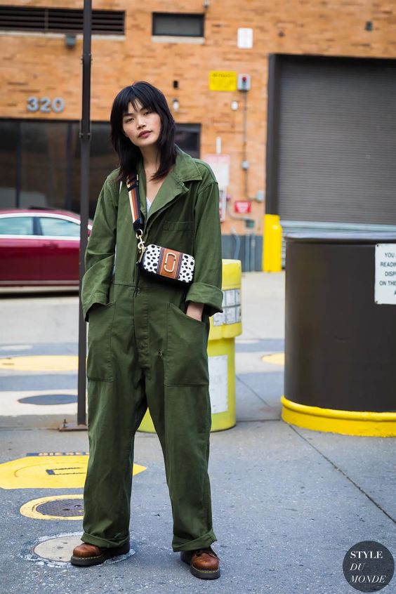 For an urban chic look, this army green jumpsuit is a must-have. The utilitarian design paired with a trendy crossbody bag and loafers creates a stylish and practical outfit. Perfect for a day in the city or a casual lunch with friends, this jumpsuit is versatile and fashionable.