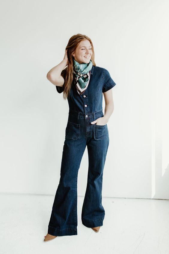 This denim jumpsuit is given a stylish upgrade with the addition of a colorful scarf. The fitted design and wide-leg silhouette are both flattering and comfortable. Pair it with heeled boots for a chic fall outfit that’s perfect for any occasion.