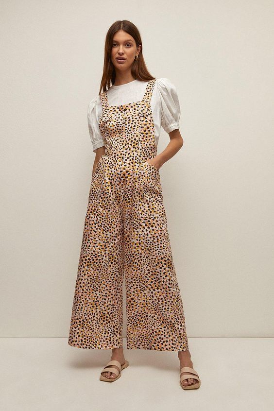 These spotted overalls are perfect for adding a fun twist to your fall wardrobe. The playful pattern is balanced by a simple white puff sleeve top and sandals. This outfit is perfect for a sunny autumn day, offering both style and comfort.