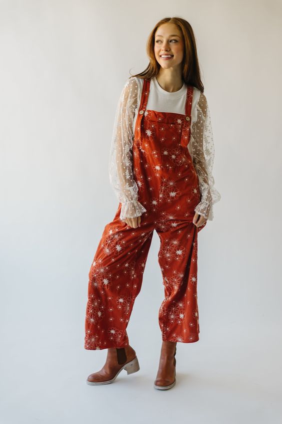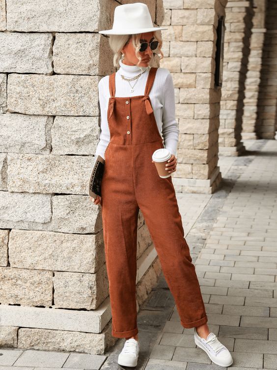 These rust-colored overalls are perfect for adding a pop of fall color to your wardrobe. Paired with a white turtleneck and casual sneakers, this outfit is both comfortable and stylish. Add a wide-brim hat and layered necklaces to complete the look.