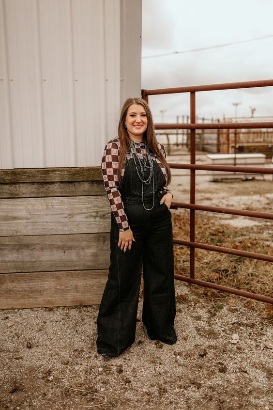 Black overalls can be effortlessly chic for a night out. This outfit features wide-leg black overalls paired with a checkered long-sleeve top. The addition of layered necklaces adds a touch of glamour, making this outfit perfect for a casual evening event.