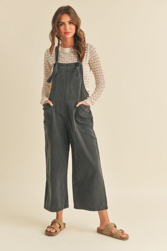 For a classic everyday look, these gray overalls paired with a lace long-sleeve top are perfect. The neutral tones make it easy to accessorize with different shoes and bags. Opt for comfortable sandals for a casual outing or dress it up with heeled boots.