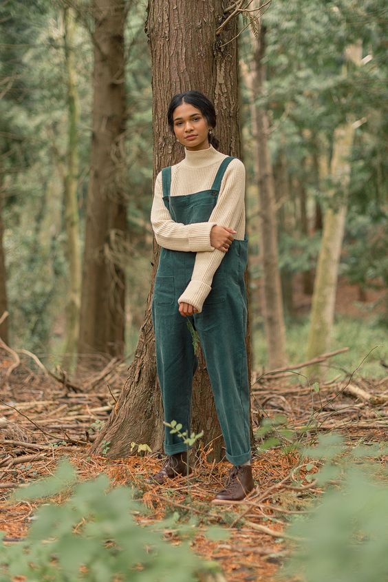 These forest green overalls are perfect for an outdoor adventure. Paired with a cream-colored knit sweater and sturdy boots, this outfit is both functional and stylish. The earthy tones blend seamlessly with the autumn landscape, making it a great choice for a hike or a day in the woods.