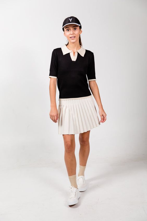 This chic outfit features a printed polo shirt and a black skirt. The tailored fit and elegant design make it a perfect choice for women who want to look classy and sophisticated while playing golf. The neutral colors and stylish pattern add a touch of elegance to your game.