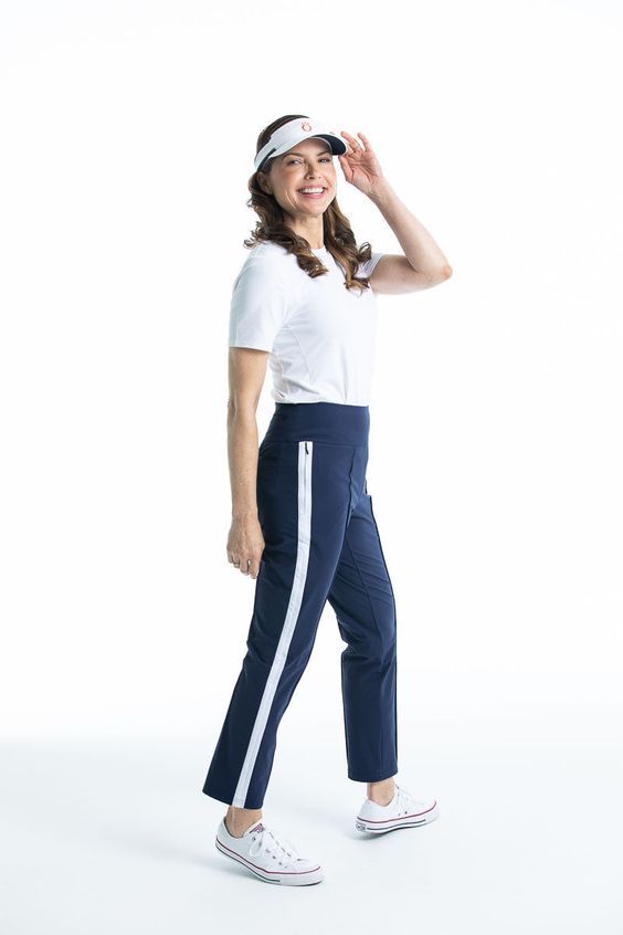 This sophisticated outfit features a striped pair of shorts and a sleeveless white top. The clean lines and classic colors create a timeless look that’s perfect for the golf course. This ensemble is ideal for women who want to look polished and put-together while playing golf.