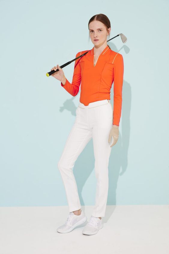 This outfit combines elegance with comfort, making it perfect for a fall day on the golf course. The beige high-waisted pants paired with a fitted white top create a classy and sophisticated look. The addition of golf gloves and white sneakers ensures functionality while maintaining style. This ensemble is ideal for women who prefer a classy and polished look.