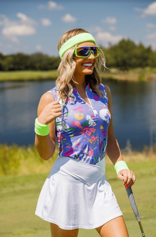 Brighten up the fall season with this vibrant pink outfit. The sleeveless top paired with a white pleated skirt creates a fun and youthful look. This outfit is perfect for warmer fall days when you want to enjoy the last bits of sunshine. It’s ideal for women who love bold colors and want to make a statement on the golf course.