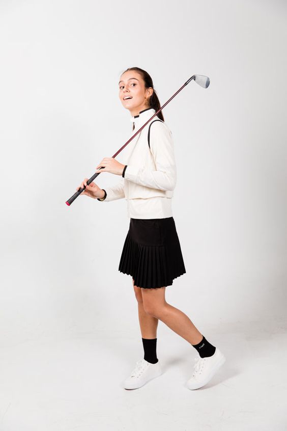 For a more relaxed and casual look, this outfit features a white sweatshirt with “GOLF” emblazoned on it, paired with a grey pleated skirt. The light layers and comfortable fit make it a great choice for cooler fall days. This look is perfect for those who enjoy a sporty style and want to stay warm during their game.