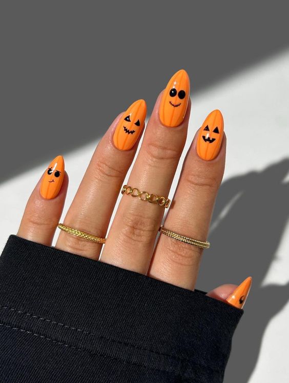 Celebrate Halloween with these fun and festive nails. The bright orange almond-shaped nails feature cute and spooky faces, making them perfect for the Halloween season. The playful nail art brings a smile to anyone who sees them, adding a bit of fun to your fall look.