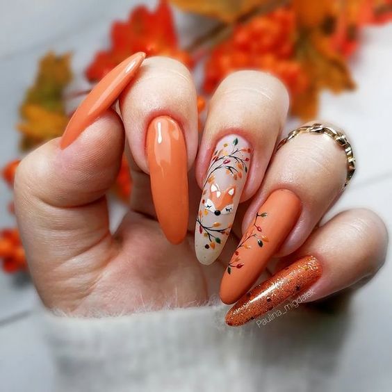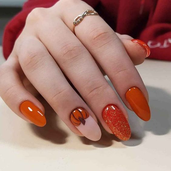 19 Amazing Orange Fall Nail Ideas 2024 With Glitter and Fall Nail Art