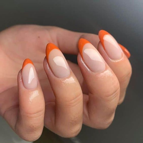 This modern take on the classic French manicure features a nude base with vibrant orange tips. The oval-shaped nails offer a sleek and timeless look, perfect for those who love the classic style but want to add a fall twist. The simplicity of this design makes it versatile for any occasion.