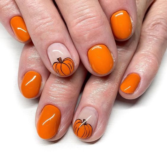 For a more subtle approach to fall nails, this design features a mix of orange and neutral shades. The round nails are kept simple with a matte finish, while one accent nail features a bold black base with a detailed leaf design. This style is perfect for those who prefer natural nails and want to incorporate fall colors without going too bold. The combination of matte and glossy finishes adds a unique touch to this elegant look.