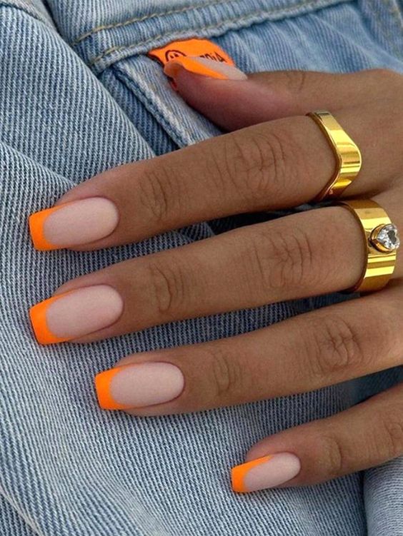 This design offers a fresh and modern take on fall nails with neon orange tips. The square nails have a nude base, allowing the neon color to pop. This minimalist yet bold style is perfect for those who want to stand out with a unique and vibrant look. The gel nails finish ensures durability and shine.