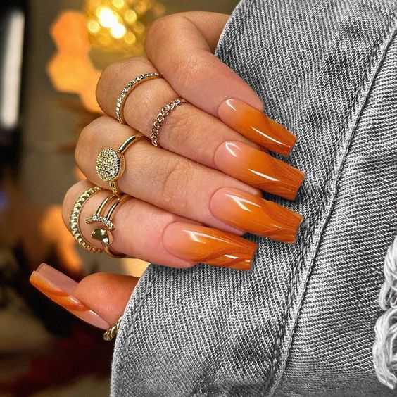 For a more understated yet chic look, this design features a gradient effect from bright orange to a softer, more muted shade. The gel nails have a smooth finish that adds a touch of sophistication. This style is perfect for those who prefer a more natural look but still want to embrace the fall colors. The square nail shape keeps it modern and easy to maintain.