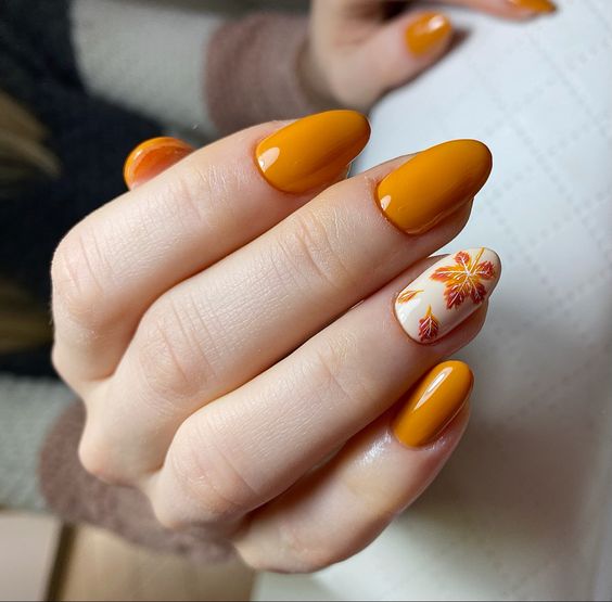 Embrace the autumn spirit with this simple yet stunning design. The oval-shaped nails are painted in a warm burnt orange, with one accent nail featuring beautifully detailed fall leaves. This nail art is perfect for those who love the season’s natural beauty and want a more understated look.