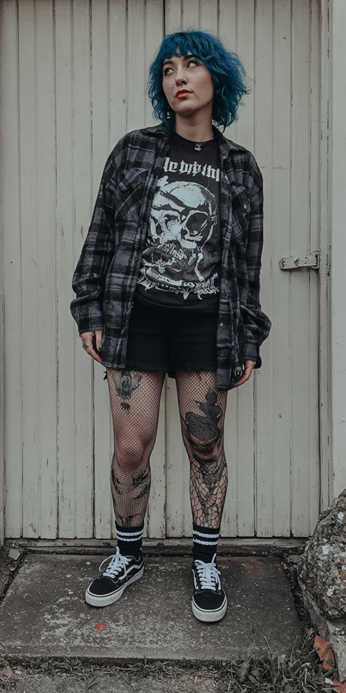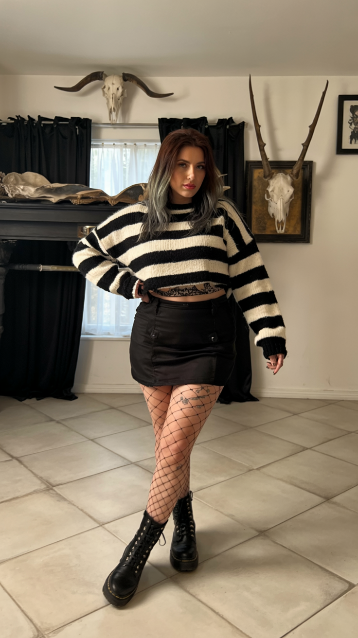 This look is all attitude in the best way. The fitted midi skirt with a dramatic slit, fishnet tights, and combat boots all make for a strong, lengthening line, while the graphic tee and dark sunglasses keep it playful and just a bit mischievous. It has that party-ready edge that works beautifully for a themed get-together, a fall event, or even a Halloween dinner where you want to look chic, not costumed. It’s Alt, it’s bold, and it absolutely works at any age.