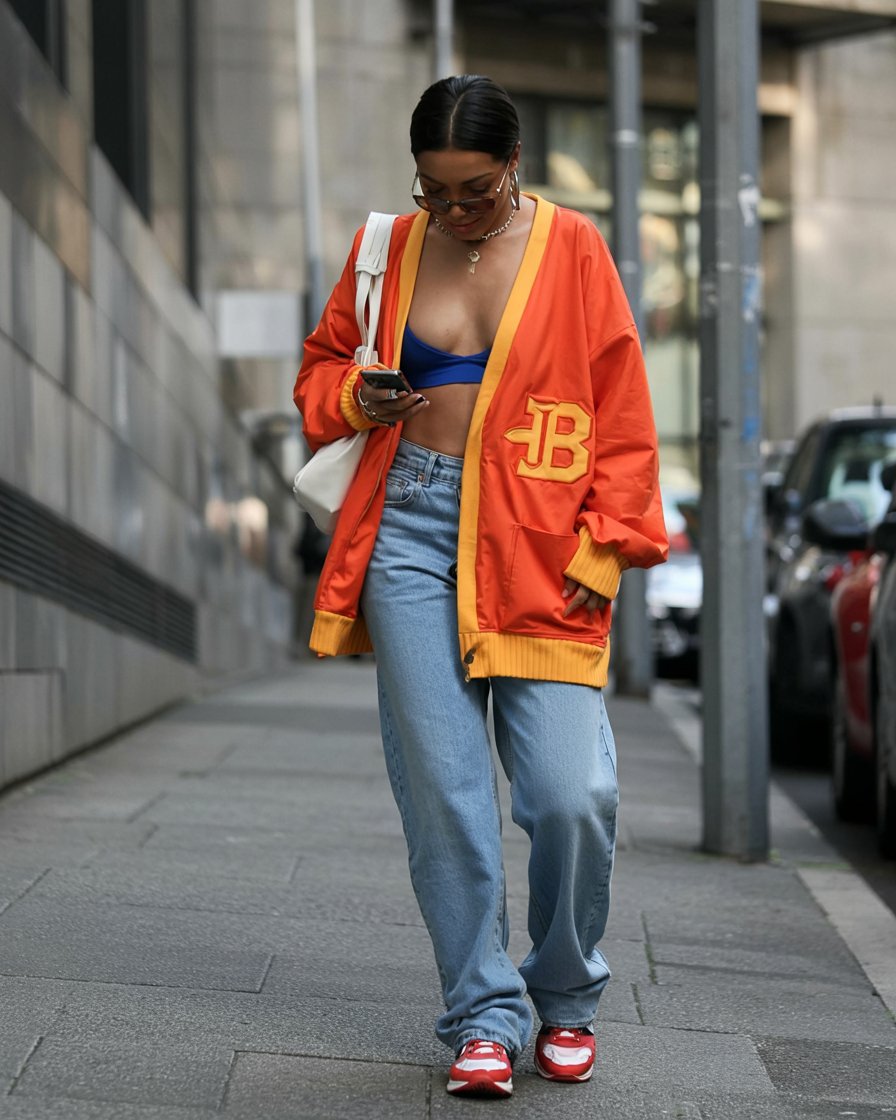 This look has such a vibrant, uplifting energy—the kind of vibe that makes you feel like you’re walking through a summer playlist. The oversized orange varsity jacket, relaxed jeans, and bright accessories bring such a soft streetwear vibe that’s warm, casual, and full of personality. It’s an effortlessly cool everyday look that feels super laid-back but is still polished enough to run out for lunch or a weekend stroll.