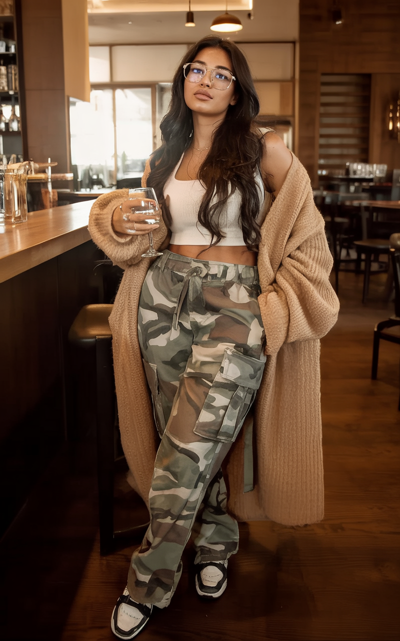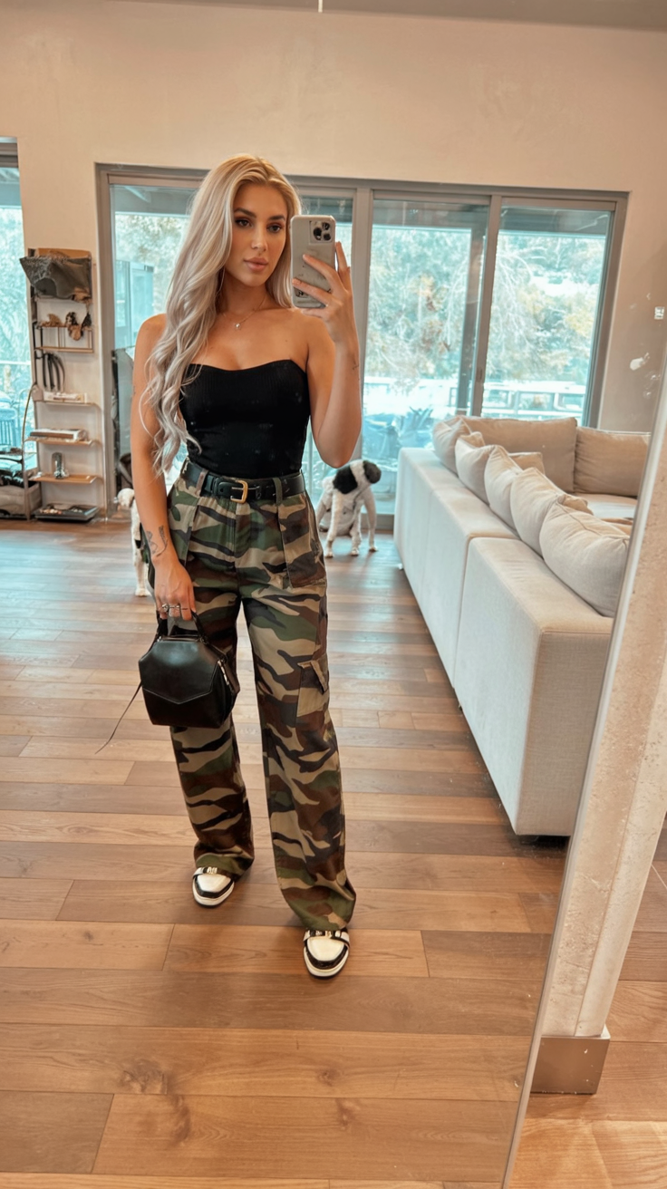 This outfit screams, “I woke up like this but still look amazing.” Camo cargo pants with a fitted black top offer a clean, balanced silhouette that is classy yet laid back. It’s one of those looks that just makes you feel connected and strong—like you can tackle whatever the day throws at you but still can manage to make lunch and run errands in style. The best part of this outfit is how low-maintenance it is: cargo pants mean pockets for everything, making them great for everyday wear, while a fitted top brings definition without fuss, and sneakers keep things practical. Add a swipe of gloss or a pink-toned blush, and you’re night-out ready without changing a thing. It’s a great 2026 basic that fits anyone wanting comfort with just a hint of streetwear attitude.