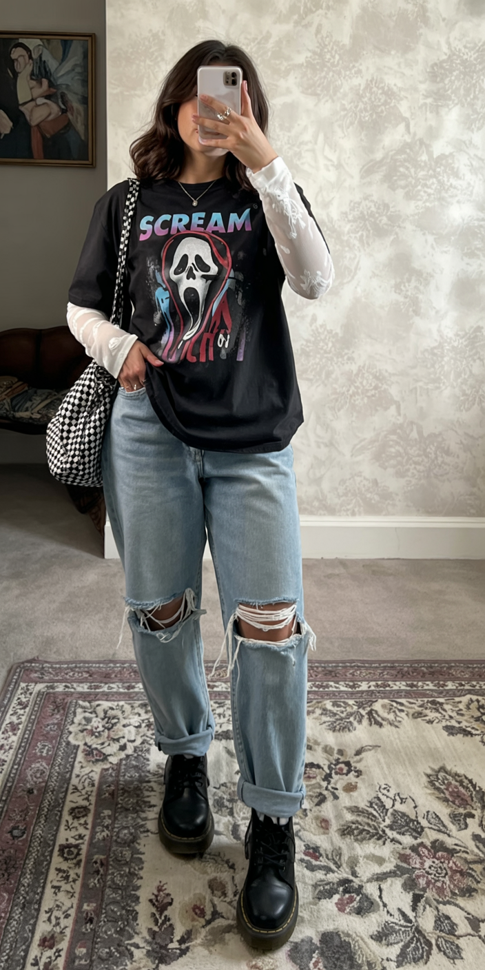 In terms of trends, layered tees and distressed denim are sticking around well into 2026, especially in the UK and urban streetwear scenes. The sheer underlayer makes your arms feel more covered while still keeping things edgy, and the boots ground everything so it doesn’t look flimsy. If you want to soften it, tuck the tee just at the front, add a cozy cardigan, or swap the boots for sleek sneakers. It’s a great fall or winter option for concerts, casual night out plans, or even a themed party.