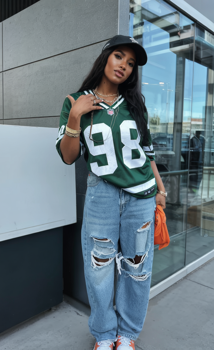 This outfit feels like Sunday game day meets downtown baddie. The oversized green jersey, ripped baggy jeans, and cap throw off serious streetwear energy, while the gold jewelry and bright accessories make it feel intentionally styled, not just thrown on. It’s sporty, playful, and perfect for Black women who love mixing casual comfort with statement details. Whether you’re heading to a tailgate, a casual party, or just running errands, it has that fun 2026 vibe that says you know your trends.