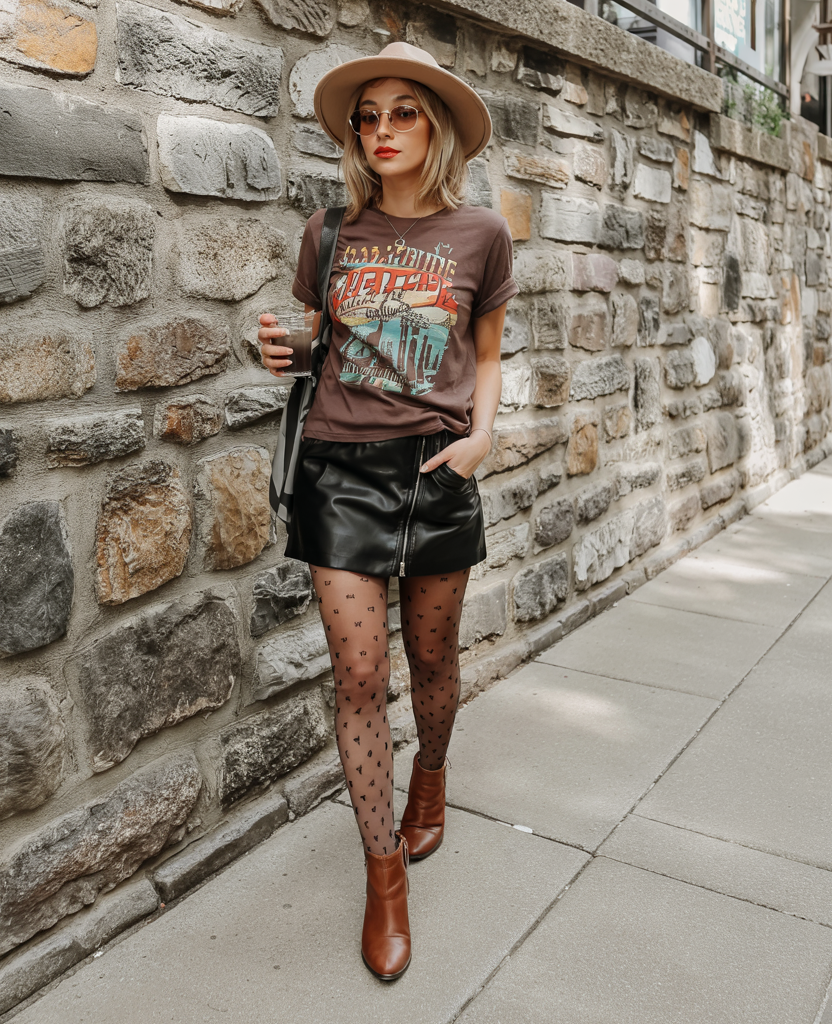 There’s such an elegant charm to this combination. The leather mini, dainty patterned tights, relaxed tee, and soft hat create a cozy fall vibe that feels like a warm latte in outfit form. It’s modest but modern, classy but still casual enough for an everyday outing. The soft waves, round sunglasses, and rich lipstick pull it all together, giving it that slightly bohemian edge that ages beautifully.