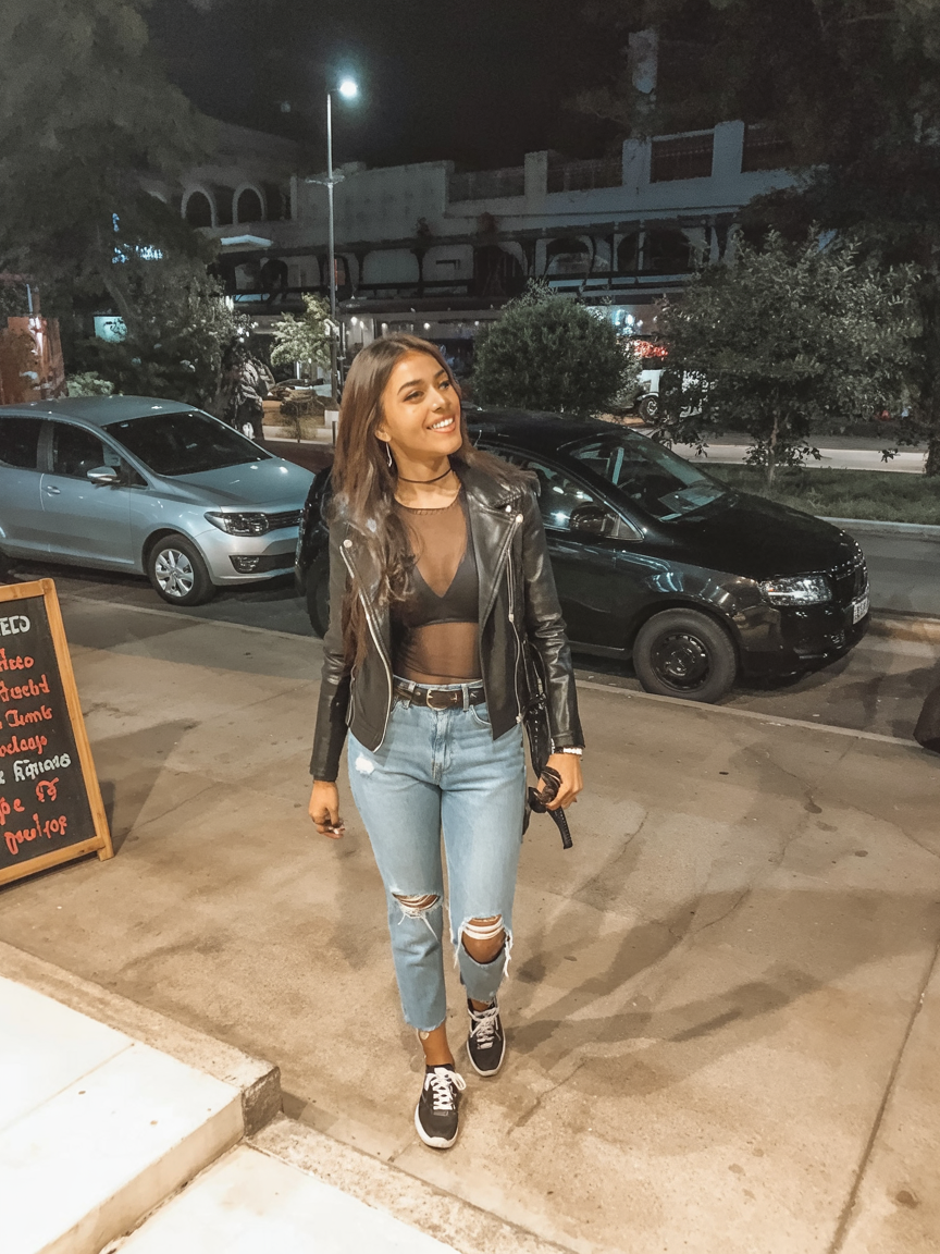This look is pure night-out electricity. The mesh top, leather jacket, and ripped jeans give that confident “I’m here to enjoy myself” mood that suits a night out at a club or a last-minute party. And it’s subtly sexy without shouting, fitting perfectly if you are one of those that love to show a little skin up top but keep your legs grounded in denim. Just picture yourself walking into your favorite spot with the music playing, knowing you look powerful but still approachable.