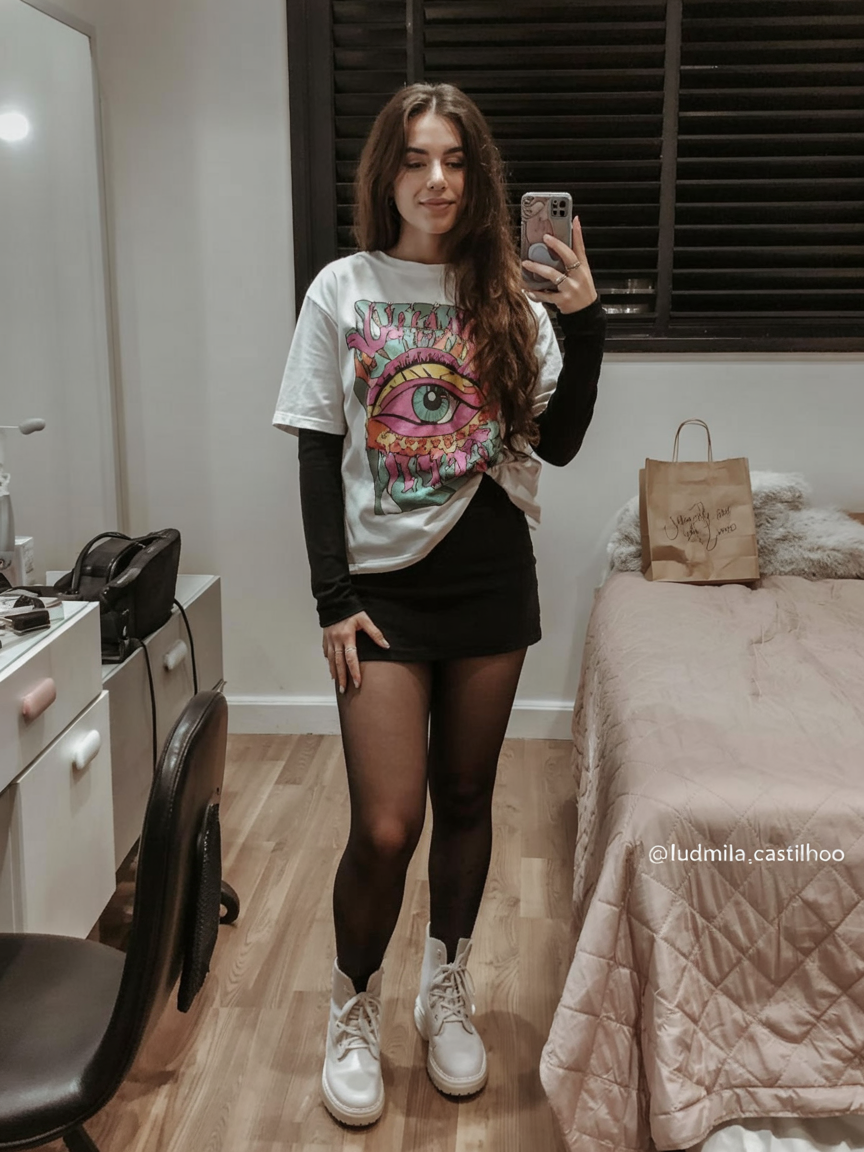 This look is like wearable art. The oversized eye print tee, layered over a black sleeve and mini skirt with tights, gives off Alt, slightly Emo energy, but in a really approachable way. The chunky boots and long hair keep it grounded and feminine, so it never feels like a costume. It’s perfect for a cozy movie night, a casual fall dinner, or those evenings when you want to be a little dramatic without going full party mode.