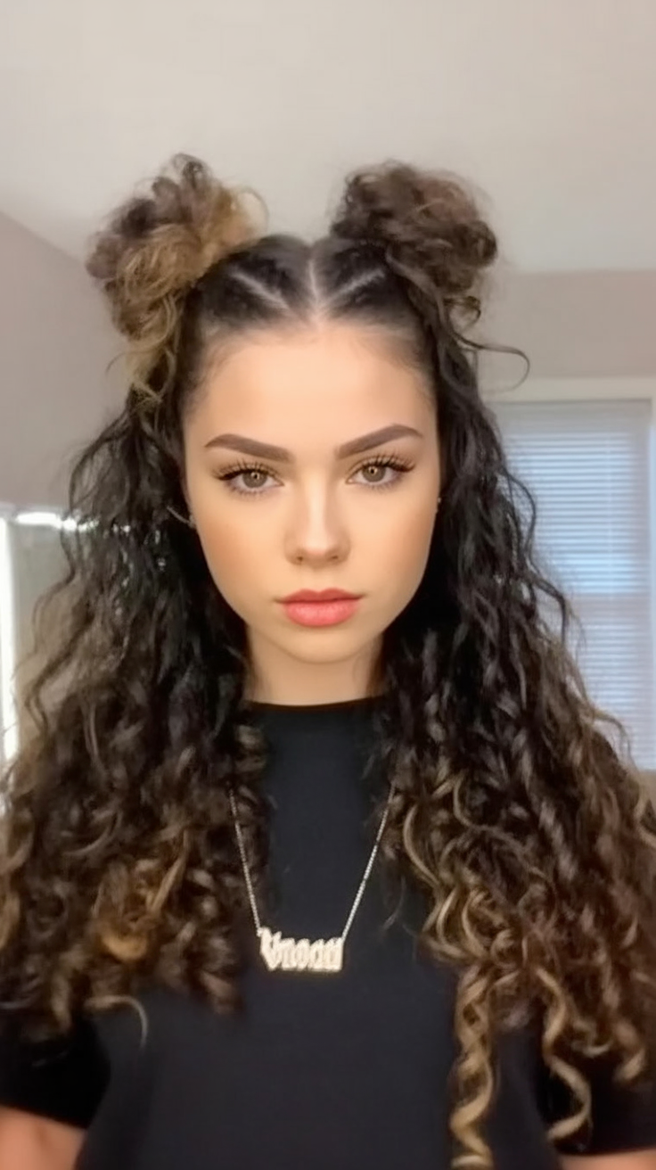 The vibe is confident, a little edgy, and very “I’m celebrating me.” It’s perfect for anyone who loves curly hair and wants a look that feels different from the usual ponytail or loose curls. To style, part down the middle, pull two top sections into mini buns, and leave the rest curly and free. If you’re working with naturally curly hair, define it first with curl cream and a diffuser; if your hair is straighter, add curls with a wand and scrunch for texture. This one reads “cute,” but it’s still cool—especially for a night out.