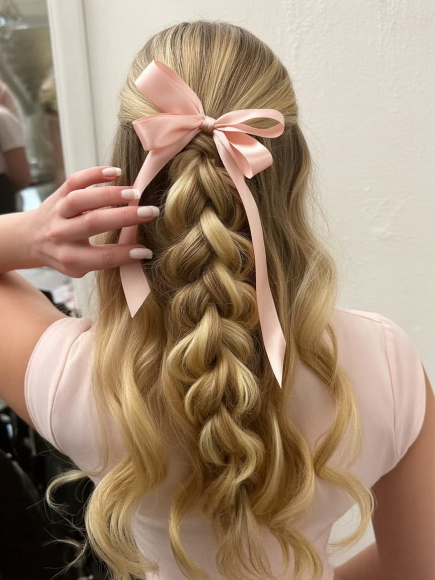 Style it with the accessories you already love: think glossy nude lipstick, pearl earrings, or a soft blushy dress—this look plays nicely with that whole “pretty and polished” mood. Curl the hair first, braid a small top section down the center, then tie the ribbon where the braid ends so it sits neatly and doesn’t slide. This is also a lovely option for fine to medium hair because the braid adds structure while the waves add fullness. Keep the ribbon ends long for movement, and finish with a light mist of spray to hold everything without stiffness.