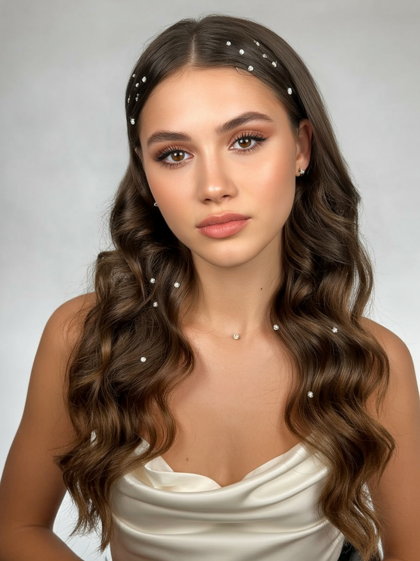 If you want a style that flatters almost everyone, this is a safe bet—especially on medium- to long-length hair. It’s gorgeous on fine hair because the wave pattern adds body, and it also looks rich on thicker textures because the finish stays smooth. Use a 1-inch iron, curl away from your face, then loosen with your fingers so the waves look lived-in. Add pearl hair accessories last so you can place them where your hair naturally falls, then finish with a soft-hold spray to keep it touchable all night.