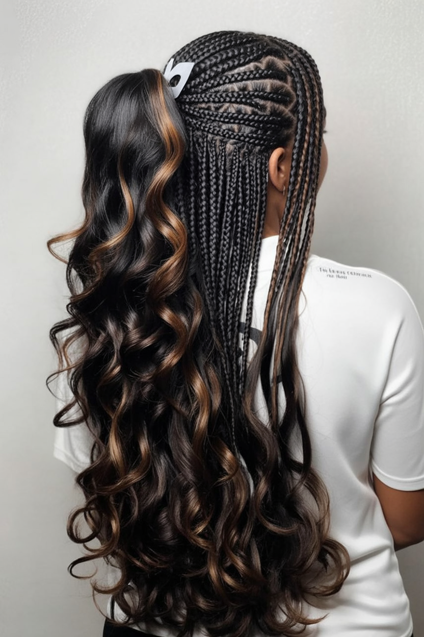 This look is such a power move because it gives you two moods at once: sleek, structured braids on top and soft, bouncy curls flowing behind. It feels fresh, bold, and seriously photogenic—like the kind of hairstyle people remember. There’s also something so satisfying about that contrast: neat and polished up top, then full and glamorous through the lengths.