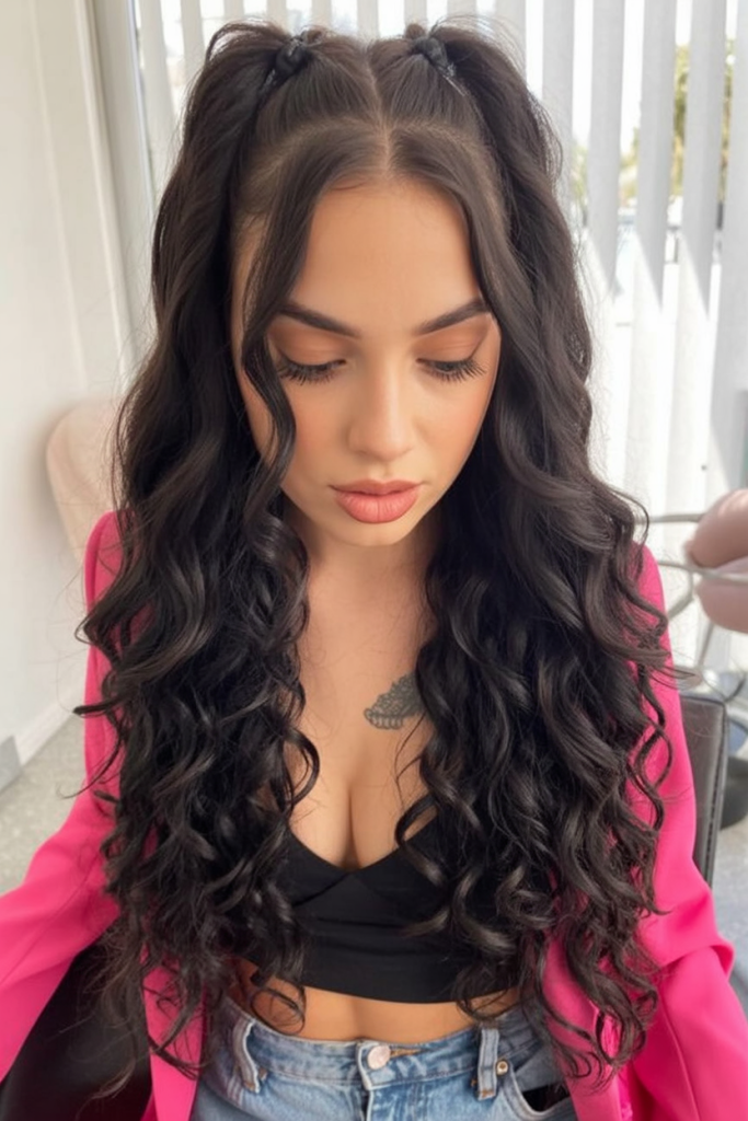 This look is pure birthday flirt—sweet, confident, and a little bit “watch me.” The double pony detail gives you that playful lift at the crown, while the long curls keep everything soft and feminine. It’s the kind of hair that makes even a simple outfit feel like you planned a whole vibe, and it has that extra bounce that shows up beautifully in photos (especially the ones taken mid-laugh).