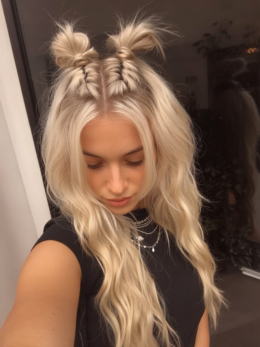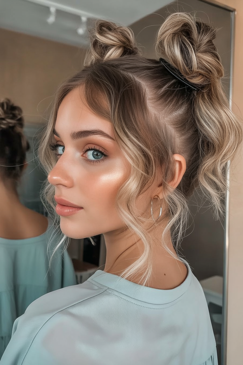 This look has been everywhere lately because it feels fresh for summer parties and casual celebrations, especially for teens who want something trendy without going full updo. It works best on medium to long hair; if your hair is fine, add dry shampoo at the roots for grip and tease the bun sections before wrapping. Keep the waves soft and slightly undone so it doesn’t turn into “pageant hair.” Bonus: it holds up well in warm weather because your face stays framed but not covered, and the buns keep the top from falling flat.