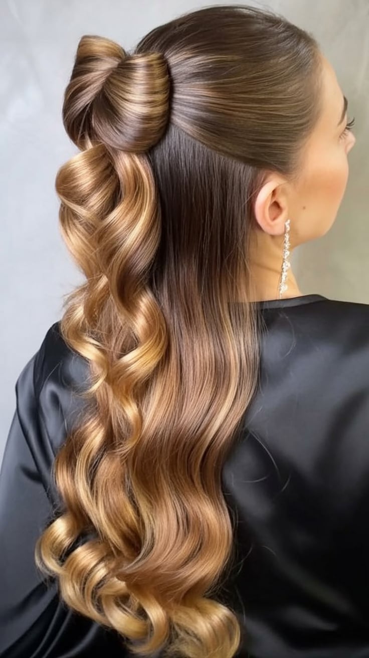 Compared to a plain ponytail, this one gives you that sculpted, elevated finish without needing a full glam updo. Start by smoothing the top into a tight ponytail—almost like a slicked-back ponytail—then use hair to form the bow shape and secure it with pins and a hidden elastic. Curl the ponytail into large, uniform waves for that glossy, ribbon-like effect. It works best on straight hair or hair that’s been blow-dried smooth, and it’s especially great for medium to long lengths. Add shine spray and you’re done—clean, dramatic, and very birthday.