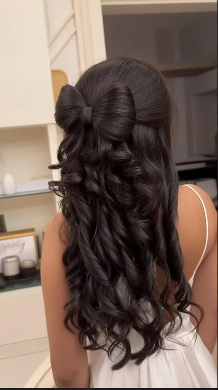 This style feels like the hair version of walking into your birthday dinner with your shoulders back and your smile already warmed up. The oversized bow detail is playful, but the glossy curls keep it grown and elegant—like you’re saying “yes, it’s my day” without needing to say a word. It’s sweet, flirty, and surprisingly chic, especially when the curls bounce every time you turn your head to laugh.