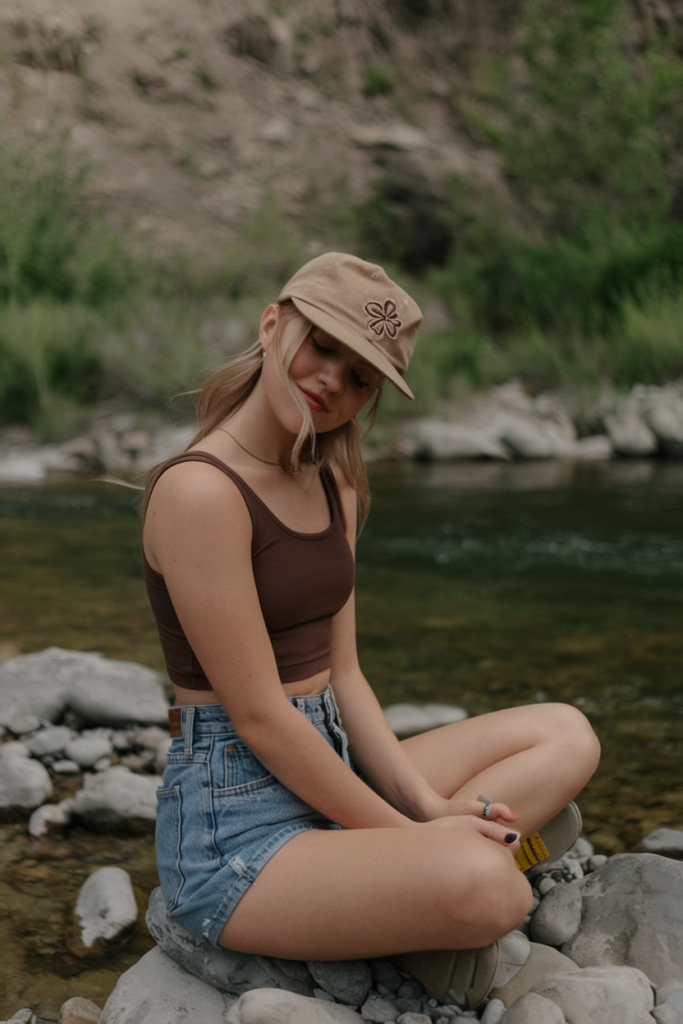This comfortable wear is a must-have for women in summer and is suitable for relaxing by a riverbank. It is a combination of a brown cropped tank top and high waisted denim shorts that makes the laid-back and yet flattering silhouette. A tan baseball cap is a sporty detail that gives a sun protection also. The simply made necklace and small rings that do not attract too much attention are the only accessories that the outfit has and this is due to the natural and aesthetic thereof.