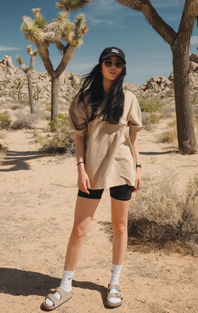 Traveling through the desert is only feasible with airy and light clothing. This oversized beige tee layered with black biker shorts gives both a stylish and functional look. The one-color scheme ensures the piece’s versatility, while the baseball cap and sunglasses safeguard against the heat. The combination of Birkenstock-style sandals with socks makes it a trendy and laid-back look.