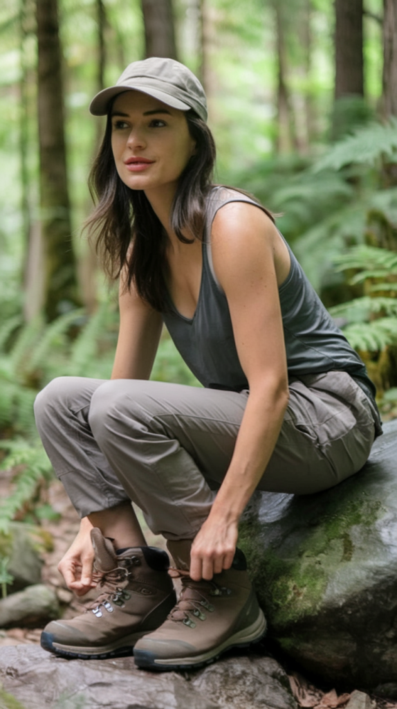 This clothing set not only has toughness but also has a fashionable look for women who enjoy outdoor activities. The design is a tank top in muted green that is lightweight, breathable, and comfortable to wear with a pair of cargo-style pants. A simple baseball cap can cover the sun while brown hiking boots give you a comfortable feeling on the rough ground. This is a perfect outfit for wandering in the woods.
