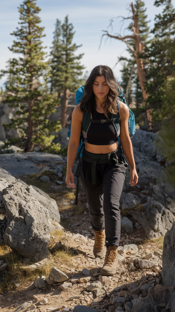 An outfit that looks sophisticated and all black meant for the hardcore hikers who go for the longest treks. The stylish sports bra and the light joggers give enough support and flexibility a person needs while climbing the mountains. Hiking by difficult trails and camping overnight require a high-performance backpack and comfortable hiking boots not to mention. Dressed like this the person is not only practical for the long trail but also very comfortable.