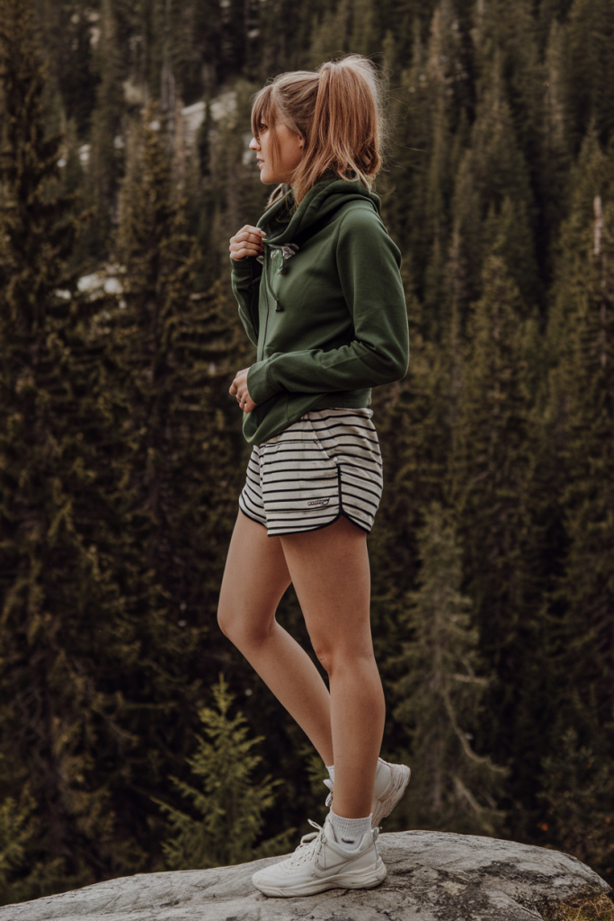 The secret of dressing for mountain camping is to layer, and this outfit is the proof of it. A dark green hoodie gives the feeling of the warmth you need while striped athletic shorts offer the most comfort. The high ponytail is a youthful, sporty style addition, and white sneakers make this women’s outdoor look complete.