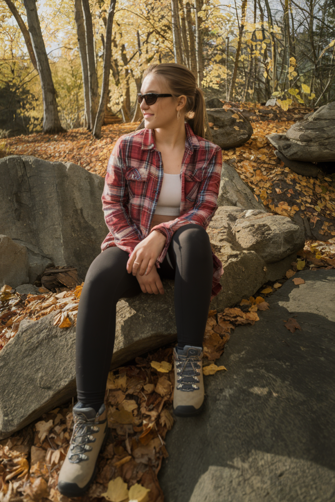 To address the need for crisp fall mornings, comprehensive layering is essential. A white ribbed crop top combined with black leggings means comfort, flexibility, and warmth, while a red flannel adds that classic aesthetics. Sharp hiking boots are the last part of the outfit that may be worn on a hike along autumn trails.