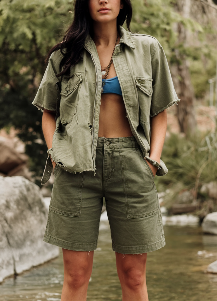 This women outdoor look is a bold take on military-inspired fashion. A frayed olive-green button-up and matching shorts make for a rugged yet stylish outfit. The blue crop top is a popping color addition, while layered necklaces bring it to the next level.