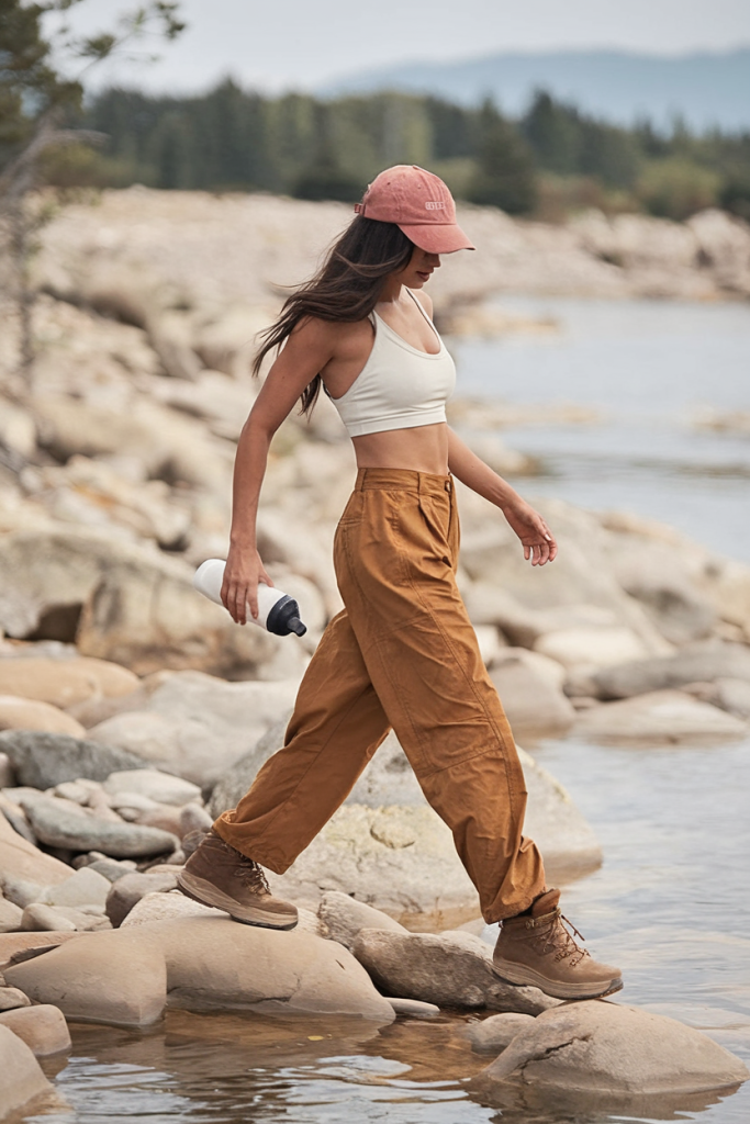 The combination of women’s summer casual vibes and practical design is the effortlessly cool look. A cream sports bra waves perfectly with the loose-fitting tan cargo pants, while hiking boots are the resistant to rocky roads. A dusty pink cap not only serves the purpose of keeping the sun at bay, but also evokes a feeling of being cute and sporty.