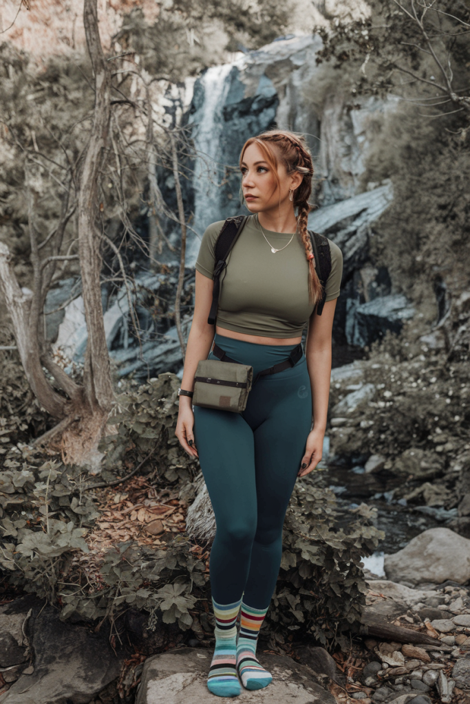 This look for camping lovers with adventure-seeking spirit is not only fashionable but also thoroughly performance-ready. The olive green fitted crop top that goes with the high waist navy blue leggings gives flexibility and support. The braided hairdo is the simplest way for fun without worries while the striped socks be a cute pop of color. A mini crossbody bag stores necessary items near your body without making you bulky.