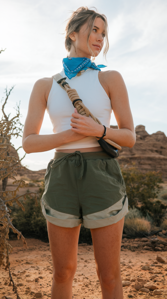 The pairing of the tank top and shorts together is not only a combination of fashion and practicality but also a cute choice camping in arid areas. The idea of wearing the blue bandana around the neck both as a decoration and a dust-protector is very clever. A rope desolate crossbody pretty well creates a hiking impression and it is a perfect piece of equipment for the minimalist who are planning to travel light.