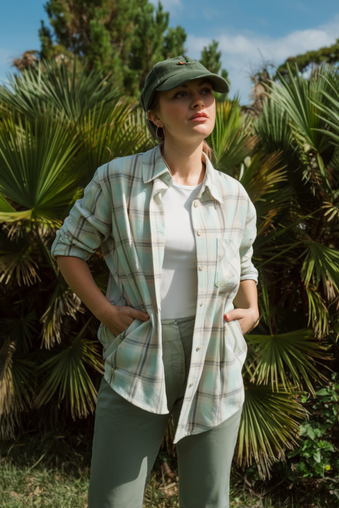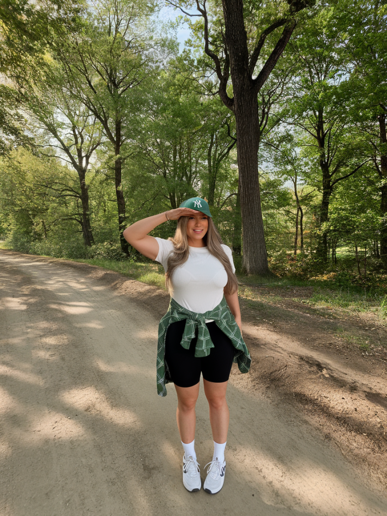 The ensemble includes a short-sleeve body-hugging white top, black biker shorts, a casual flannel tied around the waist, and a green baseball cap. This is the perfect outfit for light hiking and casual camping as it gives you the freedom of movement while looking great. The added white sneakers and high socks are the sporty touch, therefore adding the look to active days outdoors.