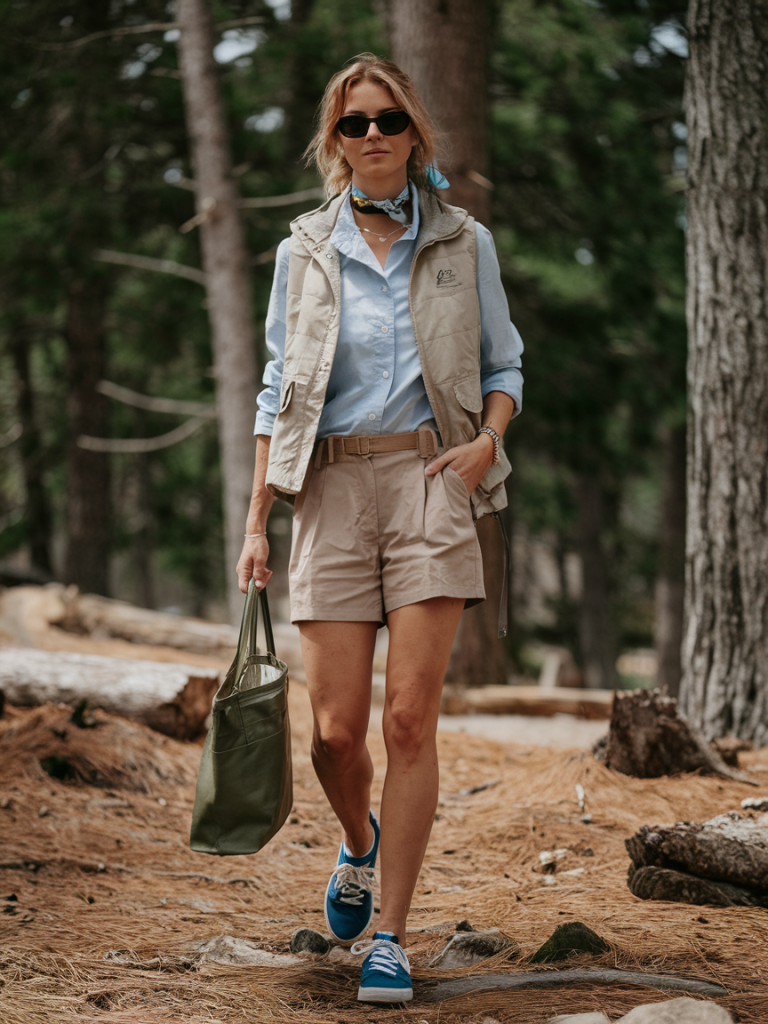 This trendy summer casual outfit with a female model includes tight beige shorts, white shirt, and utility vest. It is a combination of elegance and functionality. The double-layered necklaces and blue sneakers give this outfit a polished yet friendly look, while the scarf around the neck brings a touch of a chic, Parisian-inspired camping twist to it.