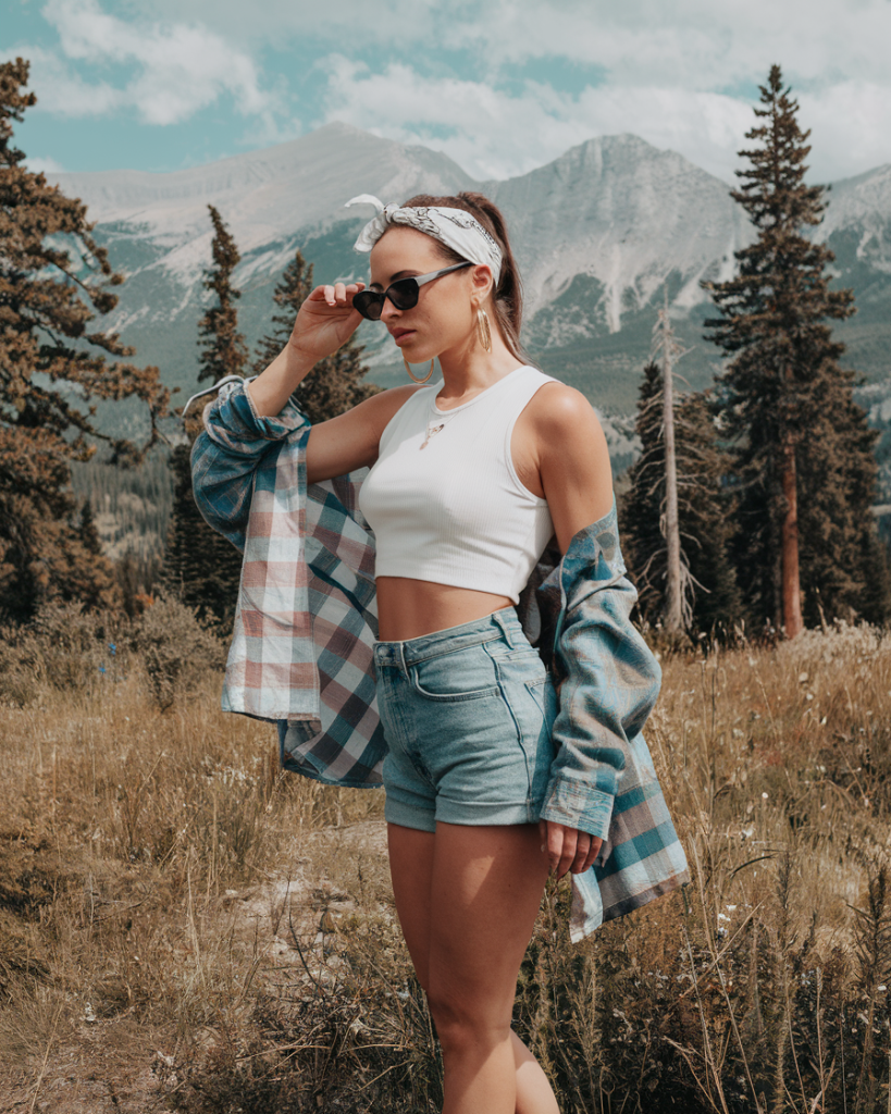 A cool, rugged look is the best representation of women outdoor fashion. Breathability is provided by a cropped white tank top and denim shorts, and a plaid flannel is the one that adds warmth for mountain mornings. The headband with the bandana is an adventure retro fashion symbol. Huge shades and gold hoop earrings make a little twist of glam to the overall look.