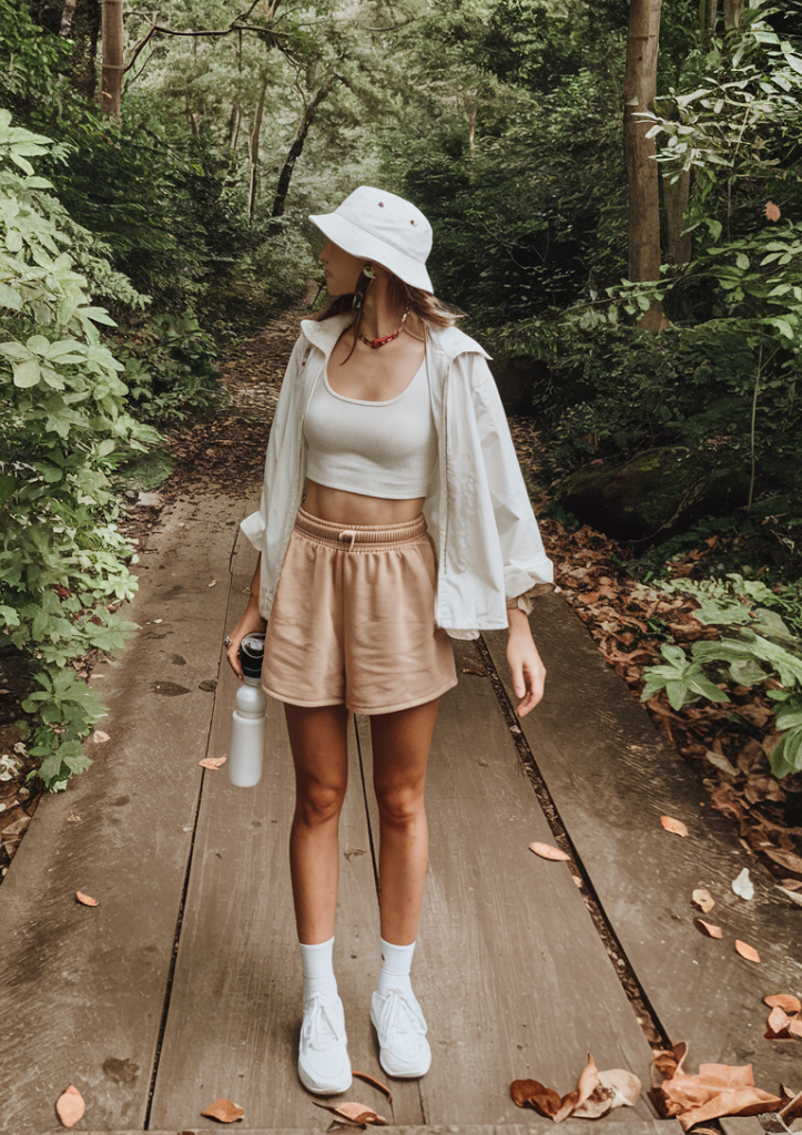 A summer casual outfit of women wearing outdoor activities while being cool and stylish is hiking. The cropped white tank top with pastel peach shorts is a chic match. The big-sized white windbreaker is an element of layering with it for unpredictable weather. A bucket hat and light accessories finish the whole sense of utterly casual.