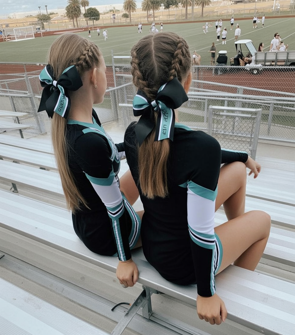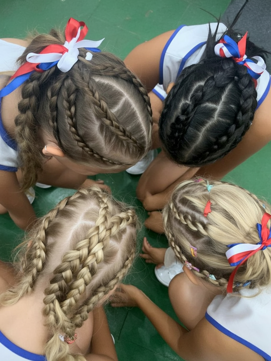 This multiple-braid look tied together with a ribbon is both detailed and dynamic. It brings depth and personality to classic cheer hair, standing out whether you’re on the court or in the stands. The ribbon adds just enough softness to balance out the boldness of the braids.